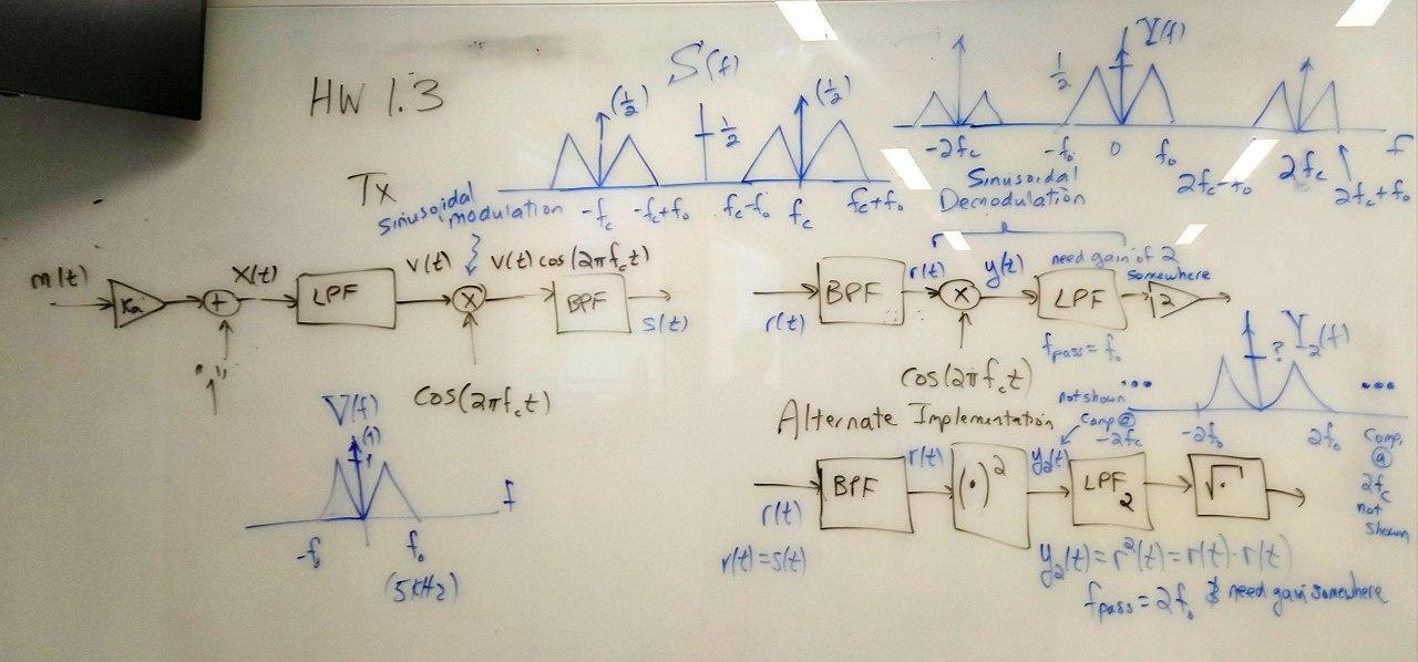 Here are the block diagrams for downconversion using (a) amplitude sinusodial demodulation which is amplitude sinusodial modulation followed by a lowpass filter, and (b) an alternate approach using a cascade of a squaring block, a different lowpass filter, and a square root block. In the alternate approach, y2(t) = r2(t) = r(t) r(t). In the frequency domain, Y2(f) = R(f) * R(f). When convolving two finite-length signals, the result has a duration that is the sum of the non-zero extents of the two signals. Since r(t) is a bandpass signal, the baseband component of y2(t) will have twice the bandwidth than that of y(t).