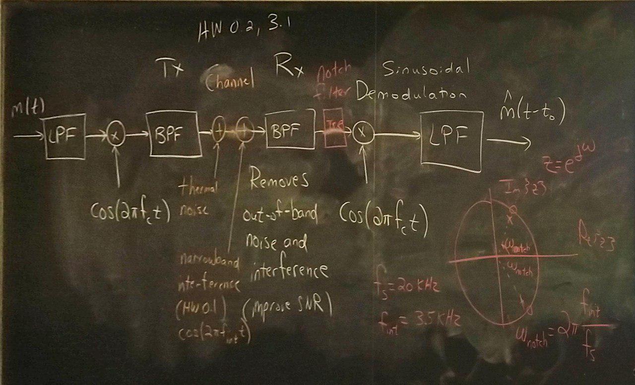 Connections to lecture. We discussed sinusoidal modulation and demodulation on lecture slides 1-6 through 1-9 for two-sided signals. Consider a two-sided baseband signal x1(t) with bandwidth w1 modulated by cos(wc t) which gives y(t) = x1(t) cos(wc t) as a two-sided signal. The spectrum Y(w) is bandpass over w in [wc - w1, wc + w1] and [-wc - w1, -wc + w1] and has bandwidth 2 w1 as shown on lecture slide 1-6. For demodulation back to baseband, we'll multiply y(t) by cos(wc t) and apply a lowpass filter. In modulating y(t) by cos(wc t), we’ll get a combination of a baseband component for w in [-w1, w1] and a bandpass component for w in [2wc - w1, 2wc + w1] and [-2wc - w1, -2wc + w1] as shown on lecture slide 1-7.