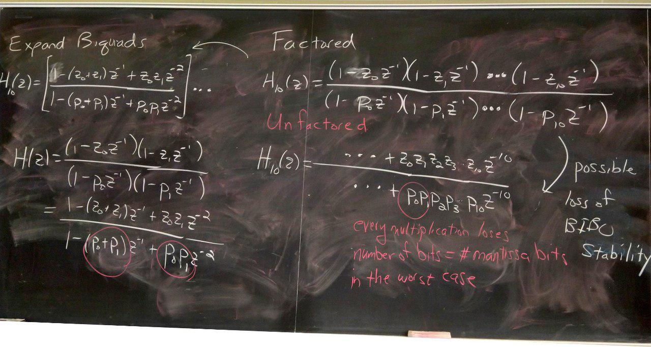 -1 -1 -1 -2 (1 - z0 z )(1 - z1 z ) 1 - (z0 + z1) z + z0 z1 z H(z) = C ------------------------ = C ------------------------------ -1 -1 -1 -2 (1 - p0 z )(1 - p1 z ) 1 - (p0 + p1) z + p0 p1 zSo, using the notation of lecture slide 6-15 on biquads,