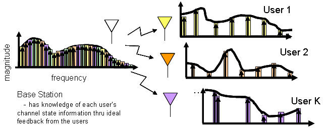 Cellular long-term evolution and Wimax basestations employ an extension Orthogonal Frequency Division Multiplexing (OFDM) known as Orthogonal Frequency Division Multiple Access (OFDMA) or Multiuser OFDM. OFDM divides the transmission bandwidth into non-overlapping narrowband subchannels. Each narrowband subchannel may carry data, or a reference/pilot signal, or neither. Subchannels with excessive noise and interference can simply go unused. Some standards allow more bits to be placed on subchannels with higher signal-to-noise ratios. OFDM is used in IEEE 802.11a/g wireless LAN systems. In current OFDM systems, only a single user can transmit on all of the subcarriers at any given time, and time division or frequency division multiple access is employed to support multiple users. The major setback to this static multiple access scheme is the fact that the different users see the wireless channel differently is not being utilized. OFDMA, on the other hand, allows multiple users to transmit simultaneously on the different subcarriers per OFDM symbol. Since the probability that all users experience a deep fade in a particular subcarrier is very low, it can be assured that subcarriers are assigned to the users who see good channel gains on them. Our research considers the basestation allocation of subcarriers, power, and data rate to each user to maximize the sum of user data rates, subject to constraints on total power, bit error rate, and proportionality among user data rates. Our initial solutions assumed perfect channel knowledge, modeled instantaneous data rates, and relied on low-complexity heuristics, as described in the following papers: