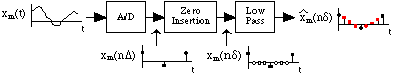 The first step of interpolation, zero-insertion, involves transforming the digital stream xm(nD) by inserting L-1 zeros after each sample. The resulting stream xm(nd) has L times more samples, and has had its sampling period reduced by a factor of L.