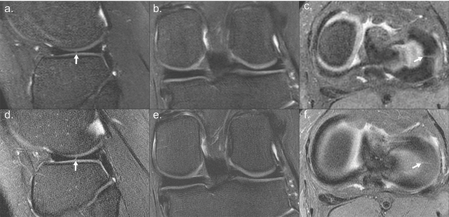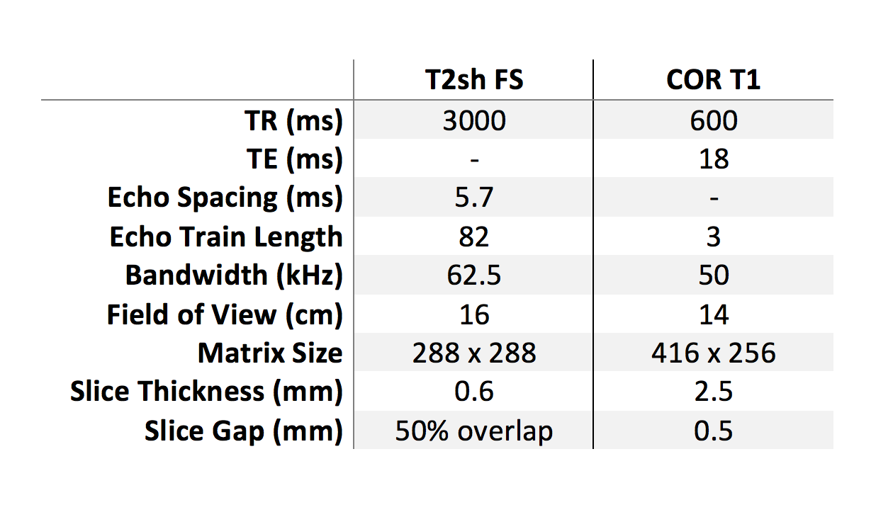 A four-dimensional fast spin-echo (FSE) acquisition that encodes the knee anatomy in volumetric fashion and also permits reconstruction of images with variable T2-contrast was implemented$$$^1$$$, termed T2 Shuffling (T2sh). The total protocol consisted of a localizer (1 minute), T2sh (7 minute), and a Coronal FSE T1 (3 minute). The scan parameters are summarized in Figure 1.