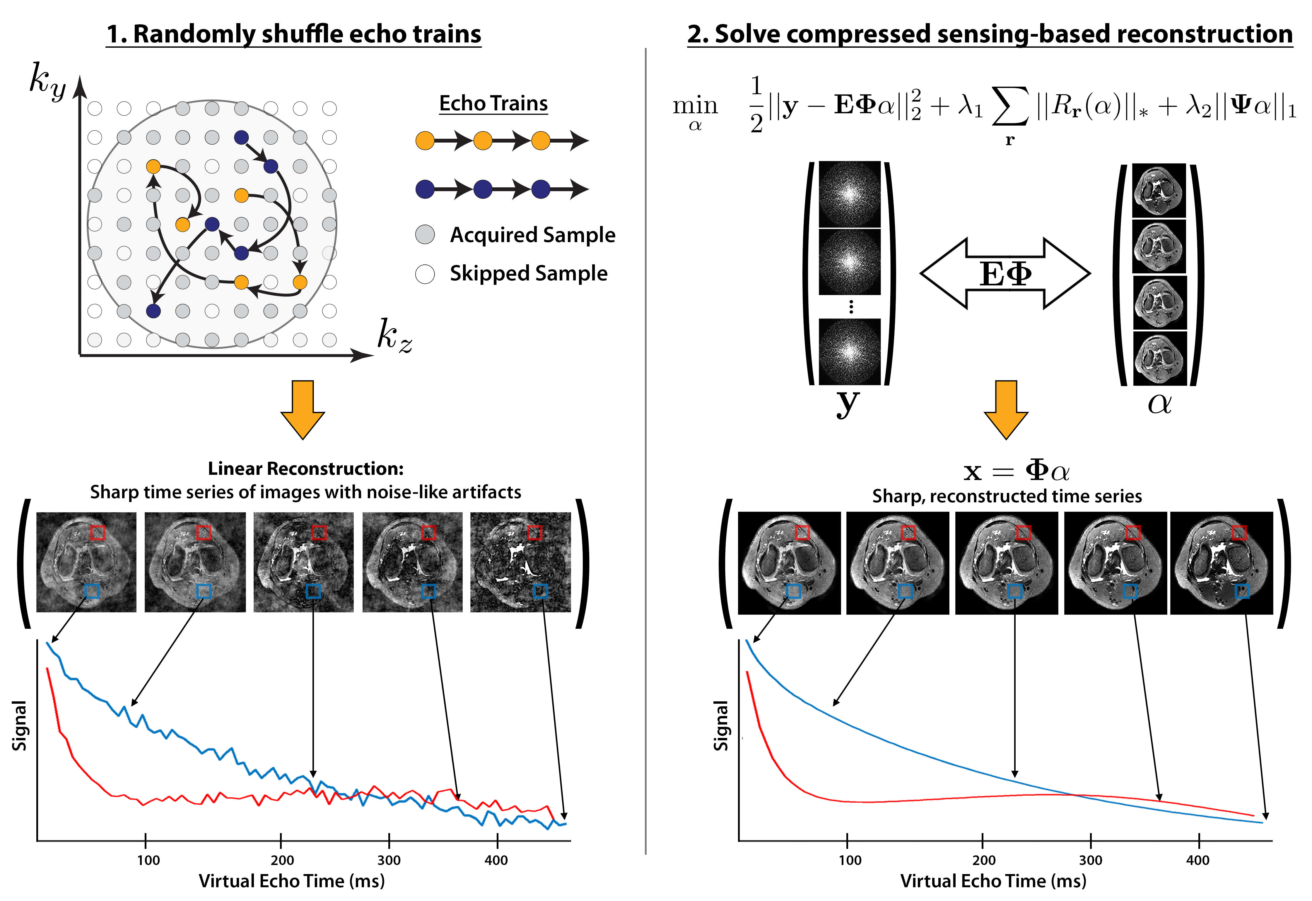 The overall methodology for the T2sh acquisition and reconstruction method is presented in Figure 2. The acquisition used a randomized view ordering to acquire phase encode samples during the spin-echo train. A compressed sensing-based reconstruction was implemented to resolve volumetric images at varying T2 contrasts.