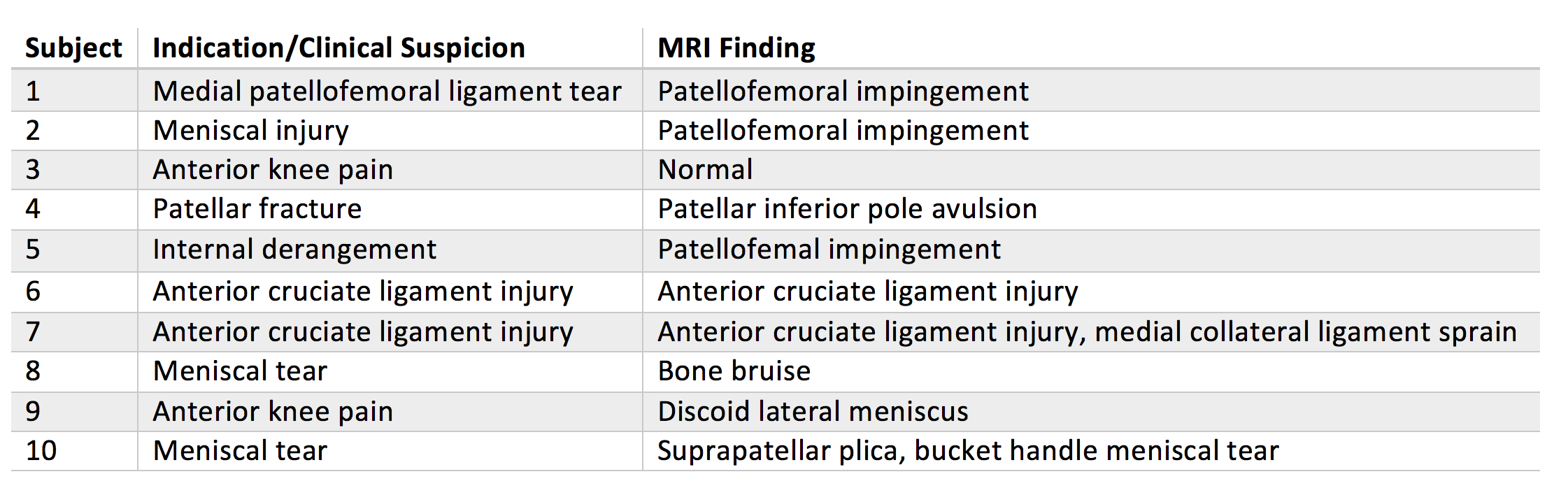Ten subjects had targeted knee MRI orders, with eight exams completed on the same day as requested. Of these eight subjects, mean time from order to completion was 138.6 minutes (minimum of 15 minutes, maximum of 310 minutes). Time from registration to exam completion averaged 48.5 minutes, with one outlier of 269 minutes due to technologist error in documentation. Omitting this outlier, mean time was 26.4 minutes. Clinical indications and MRI findings are shown in Table 1.Acknowledgements