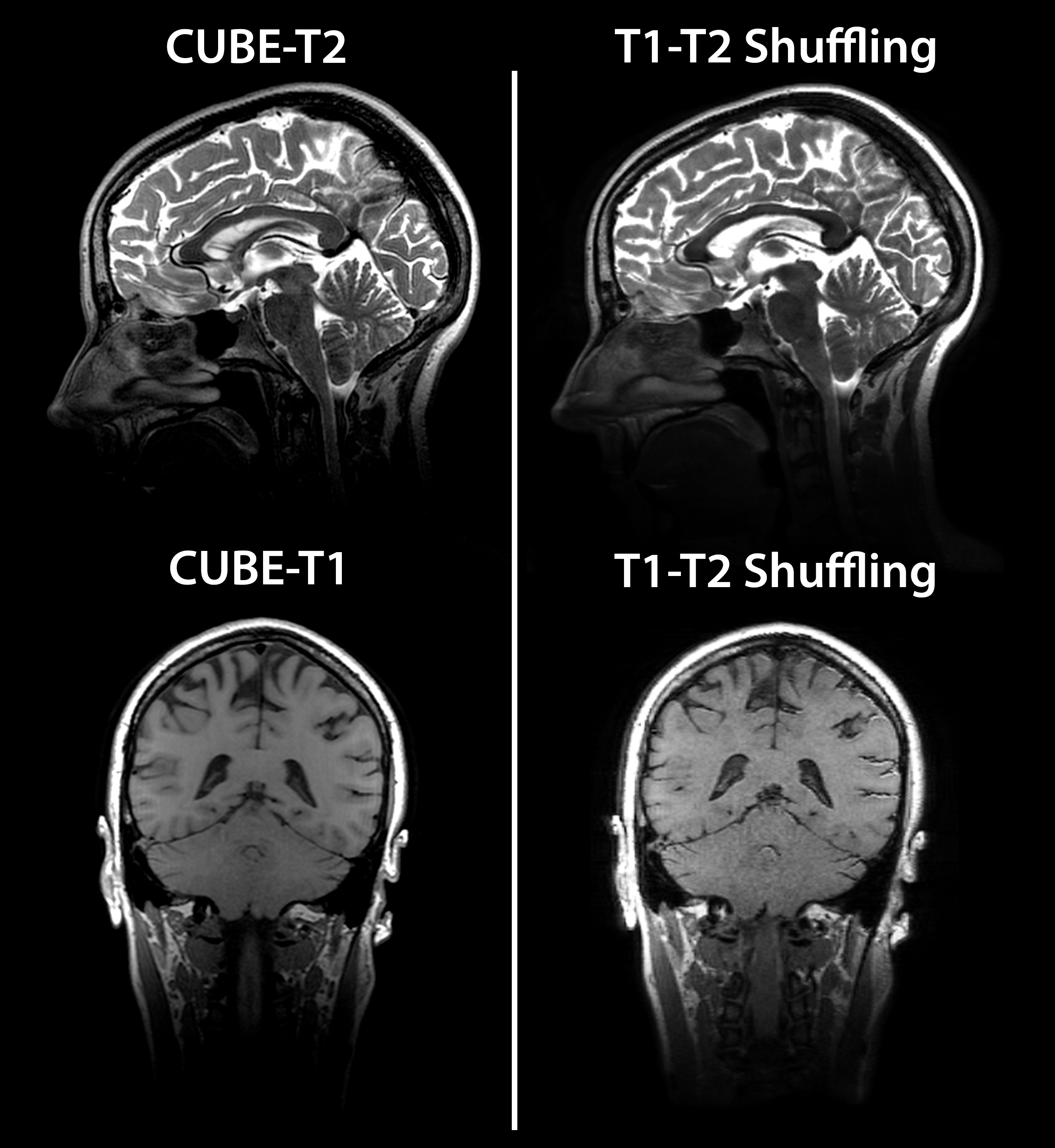 T1-T2 Shuffling provides 3D-reformattable, multi-contrast images in clinically feasible scan times.Acknowledgements