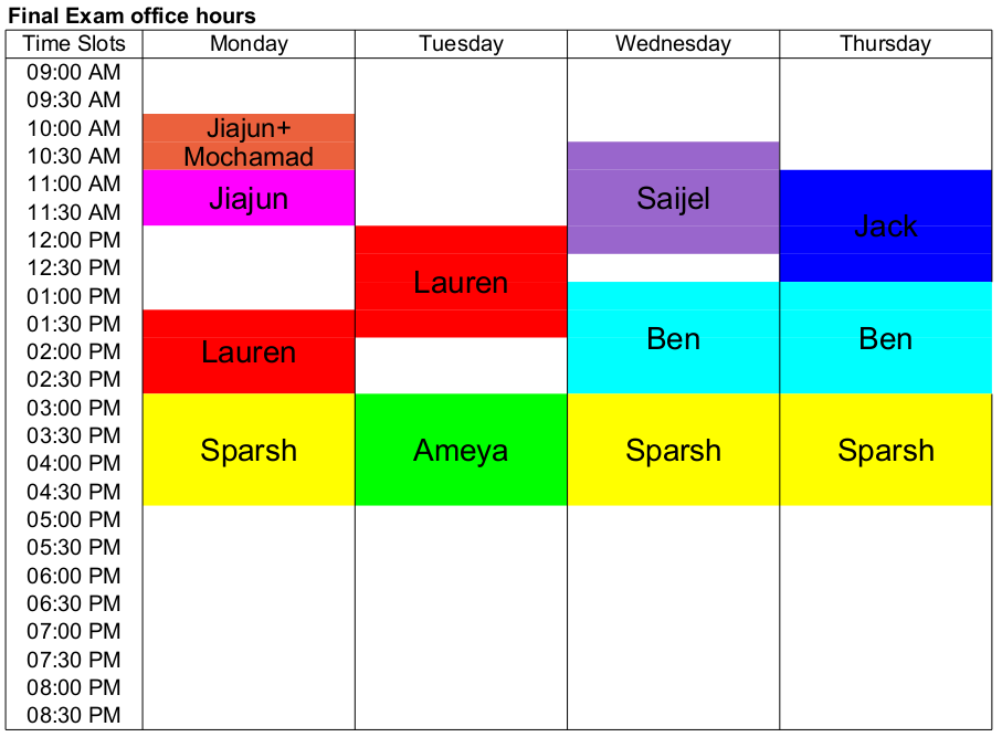 The chart below shows the office hours schedule for the finals' week. The office hours will be held in ENS 507, unless otherwise noted.
